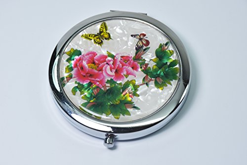 Round Compact Magnifying Make up Double sided Mirror Mother Of Pearl Art Butterfly (2 fly to flowers)