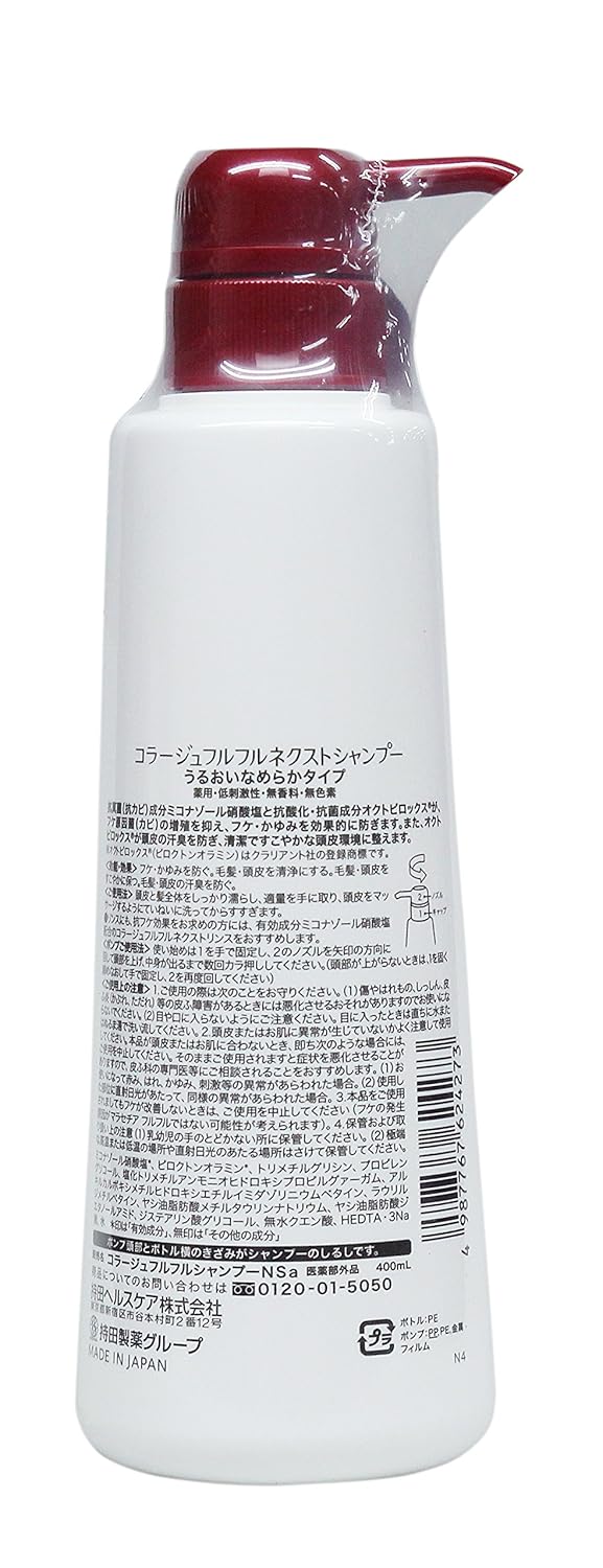 「コラージュフルフル ネクスト シャンプー うるおいなめらかタイプ 400ml」は、フケ・かゆみを原因菌から考えた薬用シャンプーです。抗真菌(抗カビ)成分ミコナゾール硝酸塩と抗酸化・殺菌成分オクトピロックス(R)が、フケ原因菌(カビ)の増殖を抑え、フケ・かゆみを効果的に防ぎます。オクトピロックス(R)が、頭皮の汗臭を防ぎ、清潔ですこやかな頭皮環境に整えます。まとまりのある、なめらかな髪に仕上げます。医薬部外品。