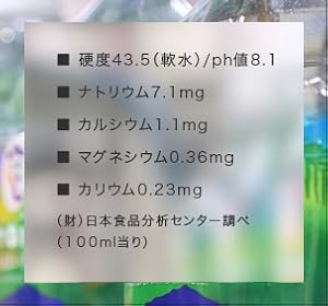 (財)日本食品分析センター調べ (100ml当り) 硬度43.5(軟水)/ph値8.1 ナトリウム7.1mg カルシウム1.1mg マグネシウム0.36mg カリウム0.23mgご注意(免責)> 必ずお読み下さい