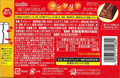 原材料:砂糖、全粉乳、カカオマス、乳糖、ココアバター、植物油脂、還元水あめ、酒精、赤ワイン、糖漬け乾燥クランベリー、糖漬け乾燥オレンジピール/乳化剤(大豆由来)、香料、酸味料