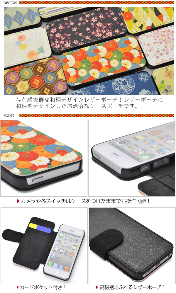 | 存在感抜群な和柄デザインレザーポーチ!レザーポーチに 和柄をデザインしたお洒落なケースポーチです。 衝撃やキズなどからiPhone5、iPhone5s/iPhone SEを守ります。 また、内部にはプラスチックケースを備え、本体をしっかりと固定します。 横開きタイプなので、手帳のように使うことができます。 カメラはもちろん、基本操作などをケースに入れたまま操作可能です! ※iPhone5、iPhone5s/iPhone SEは付属しません。 ※ライセンス商品ではありません。 | ||||||