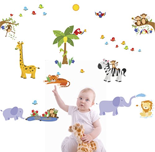 [Description] 37 VIBRANT JUNGLE ANIMALS AND SCENERY DECALS: This set includes 4 wall decals sheets that include 37 decorative stickers! Kids will adore the bright colors and the cute figures! SAVE YOURSELF TIME AND EFFORT: These decorative jungle wall clings are pre-cut_ making peeling and sticking them a matter of seconds! Altering your baby``s room atmosphere has never been easier! FUN AND LEARNING: Apart from being extremely amusing_ these wall art decals can help your child gain new knowledge_ promoting counting_ color and animal recognition through playing. PROTECT YOUR WALLS: These wall clings for baby rooms provide you with countless possibilities. Their design allows you to safely remove and reposition them without damaging your walls. 100% RISK FREE PURCHASE: Keeping you satisfied is our top goal. This is why we stand 100% behind our products_ assuring you that ordering these wall stickers for kids rooms is entirely risk free.