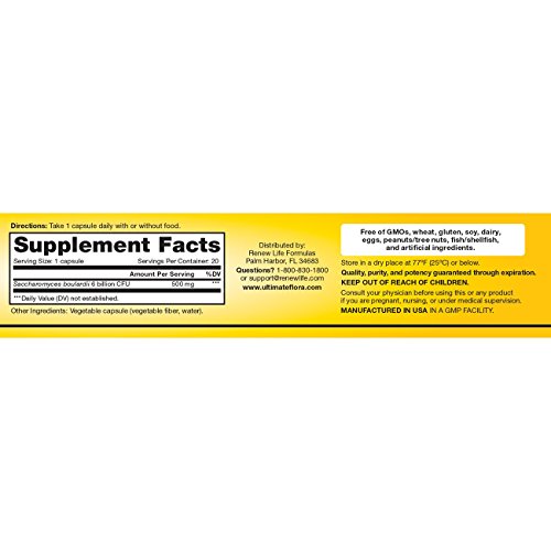 Ultimate Flora Saccharomyces Boulardii is made with 6 billion probiotic cultures (500 mg) of the clinically studied Saccharomyces boulardii strain. It helps you feel better by helping to rebalance your intestinal flora after it's been compromised. Plus, our gut-friendly strain has been clinically shown to help alleviate occasional diarrhea. This probiotic helps restore regularity and promote digestive wellness. These statements have not been evaluated by the Food and Drug Administration. This product is not intended to diagnose, treat, cure, or prevent any disease. * These statements have not been evaluated by the Food and Drug Administration. This product is not intended to diagnose, treat, cure, or prevent any disease.Feature