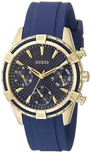 GUESS Women's U0562L2 Sporty Gold-Tone Stainless Steel Watch with Blue Dial, Crystal-Accented Bezel and Silicone Strap Buckle
