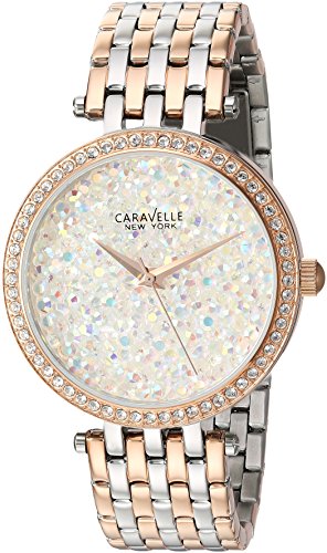 CARAVELLE NEW YORK: Caravelle New York, the stylish and contemporary diffusion brand from Bulova, offers both affordable design and reliable Bulova technology. A fluid collection inspired by the different tempos and pace of the city. Caravelle New York is poised and ready for anything. There's inspiration everywhere in the city, from the elegant lines of town-homes off of Park Avenue to the sunset hues in Battery Park City. There's always something that moves us. Caravelle New York brings you watches with an authentic New York style and attitude. With the ideal basics for any wardrobe, Caravelle New York provides the perfect combination of quality, craftsmanship and style. Add some sparkle to your style with features such as 60 individually hand-set crystals on bezel with crystal AB rock crystal dial. As well as two-tone rose gold and stainless steel case and bracelet with double-press fold-over buckle closure. Case Diameter: 38mm Case Thickness: 8mm Water Resistance: 30MFeature