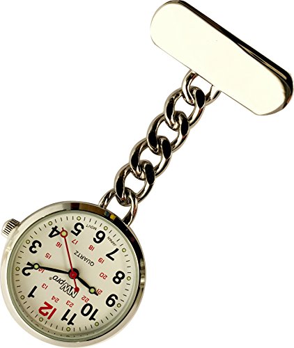NW-Pro Lapel Nurse Watch - Large White Dial - Water Resistant - Chained - Silver Tone