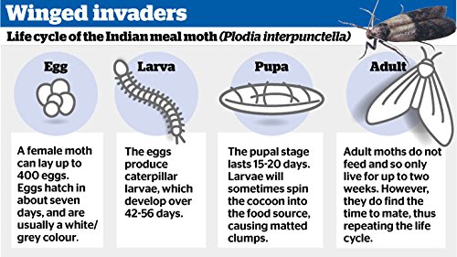 - YOU COULD BE EATING ONE RIGHT NOW: Indian mealmoths and other food moths can invade your whole grains, flour, almonds, raisins, cereal, soup mixes, rice, nuts and other dry goods including birdseed and dry pet food. Females can lay up to 400 eggs on a food surface, smaller than 0.5 mm. The larvae are very hard to spot.