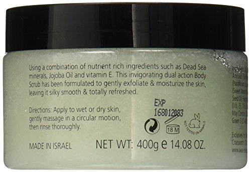 Using a combination of nutrient rich ingredients such as Dead Sea minerals, Jojoba Oil and vitamin E, this invigorating dual action Body Scrub has been formulated to gently exfoliate & moisturize the skin, leaving it silky smooth & totally refreshed. Directions: Apply to wet or dry skin, gently massage in a circular motion, then rinse thoroughly.Feature