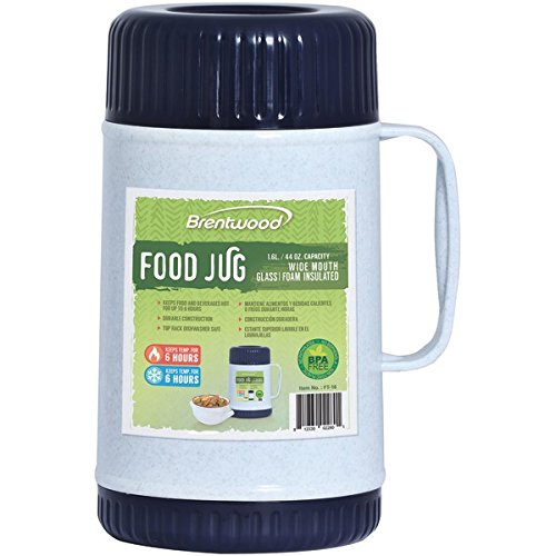 Brentwood's 44-Ounce Food Jug keeps food and beverages hot or cold for 6 hours. The durably constructed white and black jug is top-rack dishwasher safe. It's BPA-free.