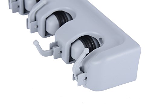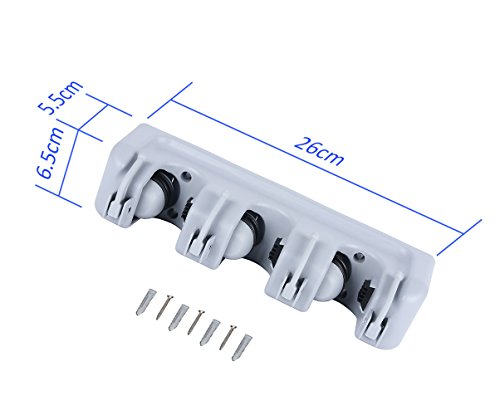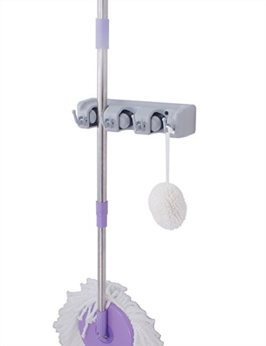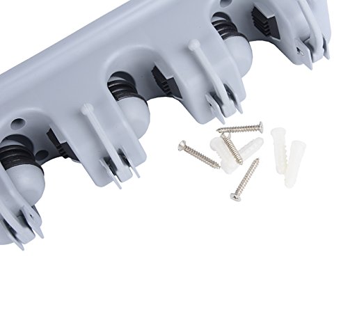 - COMPACT DESIGN: Made by high quality plastic and tough soft plastic, with 3 plastic friction-grips and 4 hooks. It is strong, sturdy, long lasting and weatherproof, that can be sliding around if needed and tidy up your mops, brooms, dustpan, shovel, towel, swiffer and your cloth that can be used in the garage, laundry room , kitchen, garden.
