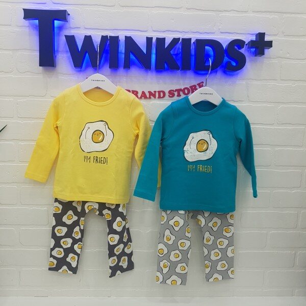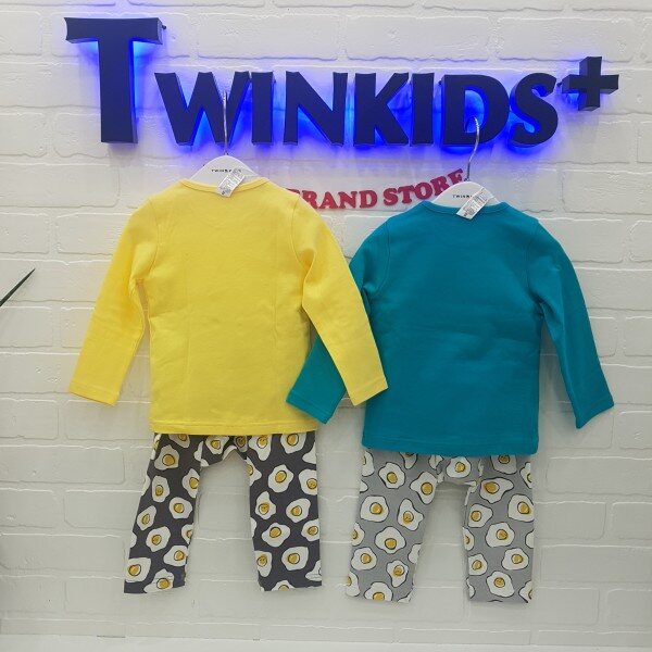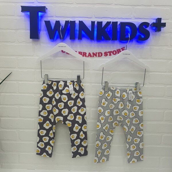 계란 후라이 패턴이 전판으로 들어가는 하의에 계란 후라이 포인트 나염이 들어가는 상의로 구성된 상하 세트