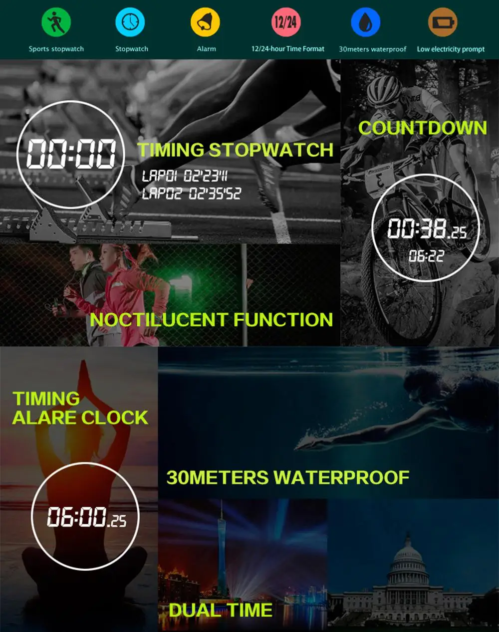 Feature:Moon Phase,Back Light,Alarm,Water Resistant,Multiple Time Zone,Chronograph,Shock Resistant,Repeater,Stop Watch,Complete Calendar,Swim,Auto Date,LED display