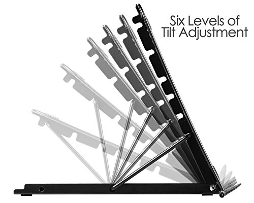 -. Feature : Elegant metal mesh surface for better airflow, ventilated laptop stand helps keep laptops running cooler to help reduce crashes / Six speed adjustable, effect protection of the cervical spine. / Non-slip feet keep your stand in place. / Mesh metal platform helps to draw heat away from laptop / tablet / Can be used with laptops / iPad / tablets and more