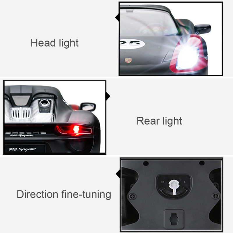 This is our brand new and high quality Porsche 918 Spyder remote control car which is a perfect gift and toy for your children. It has a fashionable outlook and full function for forward, reverse, left and right, head lights and tail lights. Don't hesitate to buy it now!