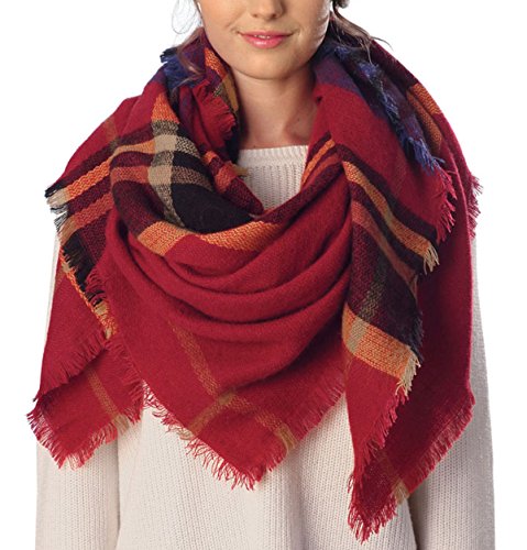 -. Feature : MATERIAL - 100% Acrylic. Extremely soft as Cashmere feel. / DIMENSIONS(IN) - PLAID Color : 55" x 55" , TARTAN Color : 51" x51", CHECK Color : 55" x 55". Those are over-sized blanket shawl scarf. / FEATURES AND DETAIL - Over-sized multi plaid checked pattern scarf with fringes at ends. Over-sized enough to be worn as a shawl and use as throw on knee blanket. Also, use as a picnic blanket during fall activities. Wrap the shawl freely around any outfit and it will keep you warm all day long. / FASHIONABLE WHILE WARM - Easy to wear and pair with other clothes. The over-sized poncho wrap shawl design is the new trending fashion statement of the fall and winter season. There's nothing more soothing than to be wrapped in warmth on a cold day, and this multi colors plaid square shawl scarf ought to do the trick. Whenever you want to keep away from chill and stay stylish, just wrap yourself up in this comfy beauty. Also, It is the best gifts for family and friends. / COMPLIMENTARY GIFT- We are offering free beautiful scarf brooch pin.(Gold or Silver Color)