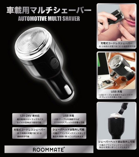 ●車載用の充電式シェーバーと本体のUSBポートからスマホやタブレットの充電が可能な多機能シェーバーです。