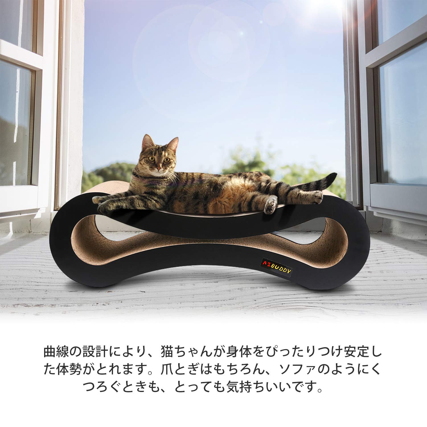 曲線設計】曲線の設計により、猫ちゃんが身体をぴったりつけ安定した体勢がとれます。爪とぎはもちろん、ソファのようにくつろぐときも、とっても気持ちいいです。