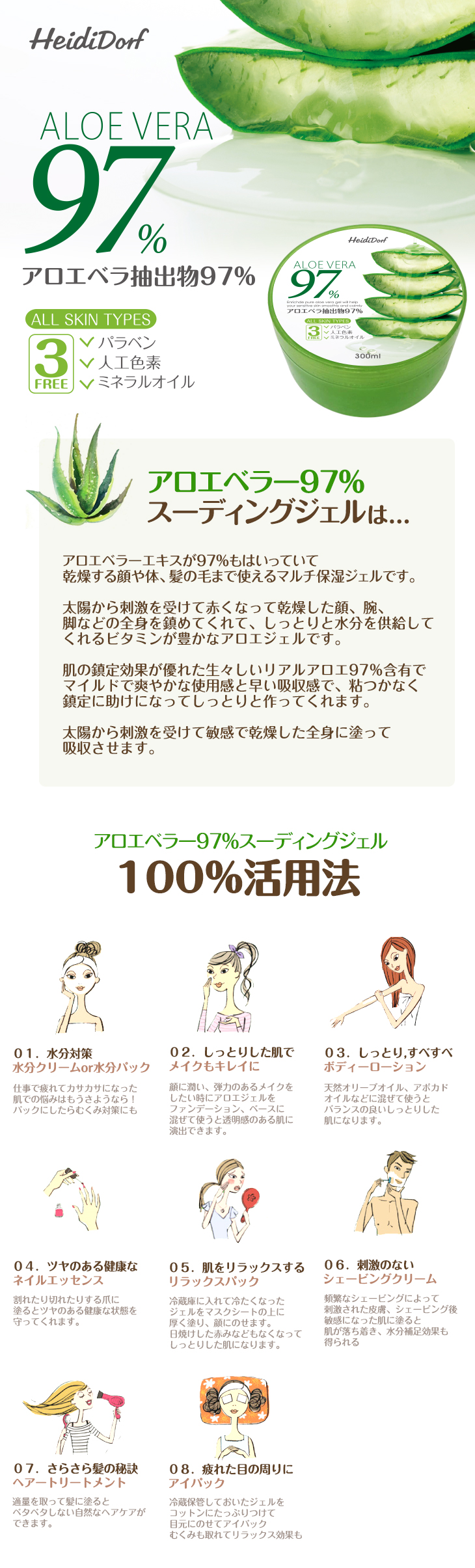 アロエベラ葉エキス、水、グリセリン、変性アルコール、シャクヤク根エキス、スイカズラ花エキス、クララ根エキス、オウゴン根エキス、チャ葉エキス、PG、PEG−40水添ヒマシ油、TEA、香料、カルボマー