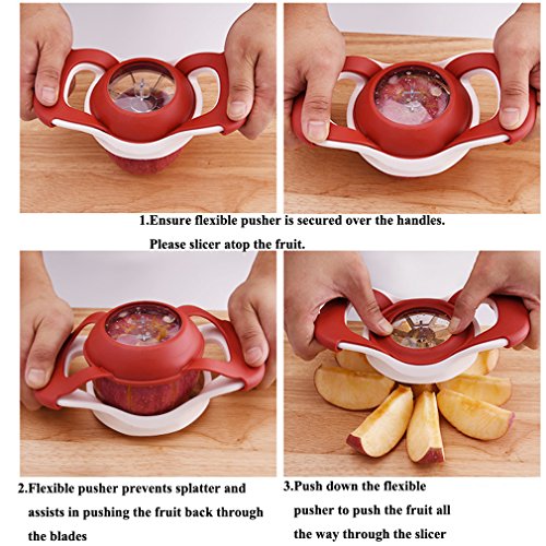 Studio : HengHai Publisher : HengHai Product Description Grips Pop-Out Apple Slicer, Corer and Divider features efficient sharpand a flexible removable cover, stainless steel blades divide fruit quickly and evenly for cutting through hard apples or pears How to operate it: Step1:Ensure flexible pusher is secured over the handles.Place slicer atop the fruit Step2:Flexible pusher prevent splatter ans assists in pushing the fruit back through the blades Step3:Push down the flexible pusher to push the fruit all the way through the slicer