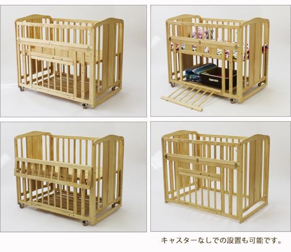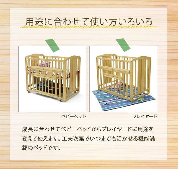 | 天然木・天然塗料で木の素材を活かしたベッドは、通気性・吸湿性に優れています。成長に合わせてベビーベッドからプレイヤードに用途を変えて使えます。工夫次第でいつまでも活かせる機能満載のベッドです。 |