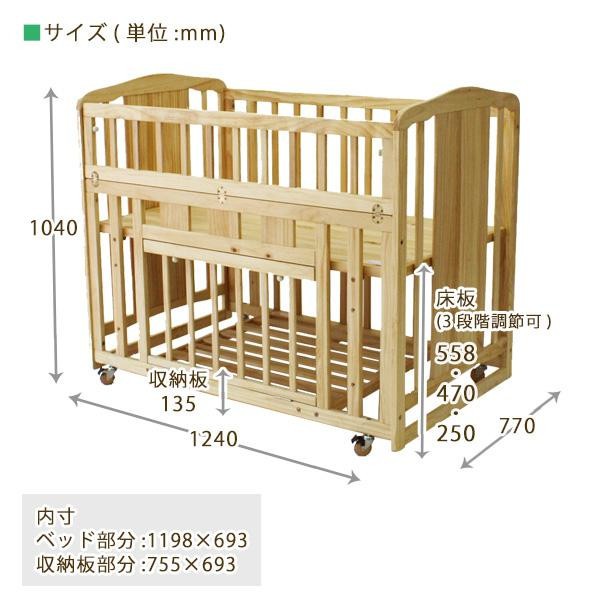 | 仕様 | 対象年齢:0か月~24か月(80cm頃)まで 耐荷重:ベッド部分30kg、収納板部分30kg 床板高さ3段階調節可 組立品 |