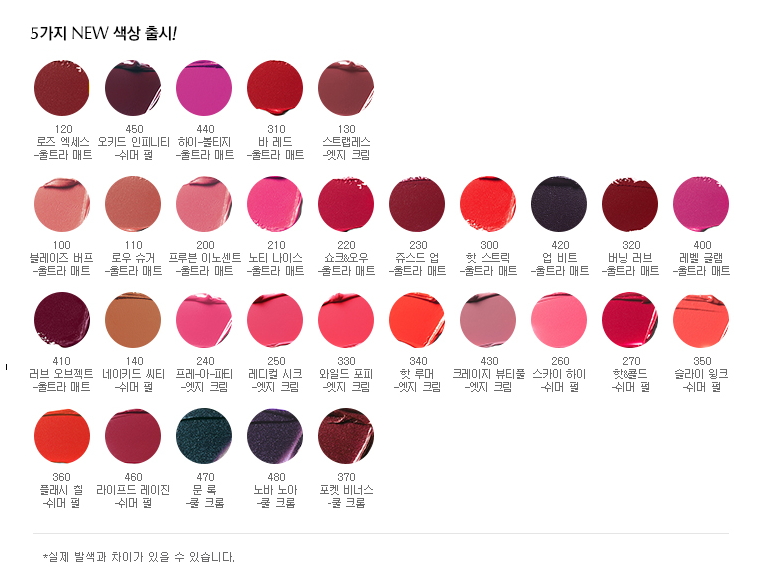 전성분: 울트라 매트: 옥틸도데칸올 , 트리이소스테아릴시트레이트 , 오조케라이트 , 트리카프릴릴시트레이트 , 실리카 , 마이크로크리스탈린왁스 , 카나우바왁스 , 드럼스틱오일/하이드로제네이티드드럼스틱오일에스터 , 에칠헥실팔미테이트 , 카프릴릭/카프릭트리글리세라이드 , 비닐디메치콘/메치콘실세스퀴옥산크로스폴리머 , 석류씨오일 , 아사이야자오일 , 망고씨오일 , 토코페릴아세테이트 , 폴리데센 , 아스코빌팔미테이트 , 사카린 , 향료 , 틴옥사이드 , 칼슘소듐보로실리케이트 , 합성플루오르플로고파이트 , 칼슘알루미늄보로실리케이트 , 펜타에리스리틸테트라-디-t-부틸하이드록시하이드로신나메이트 , [+/- 마이카 , 티타늄디옥사이드 , 적색202호 레이크 , 적색산화철 , 황색산화철 , 흑색산화철 , 적색218호 , 망가니즈바이올렛 , 황색4호 레이크 , 적색103호의(1) 레이크 , 적색226호 레이크 , 적색201호 , 카민 , 비스머스옥시클로라이드 , 적색227호 레이크 , 적색223호 , 황색5호 레이크 , 청색1호 레이크 , 적색104호의(1) 레이크] (ILN43107)