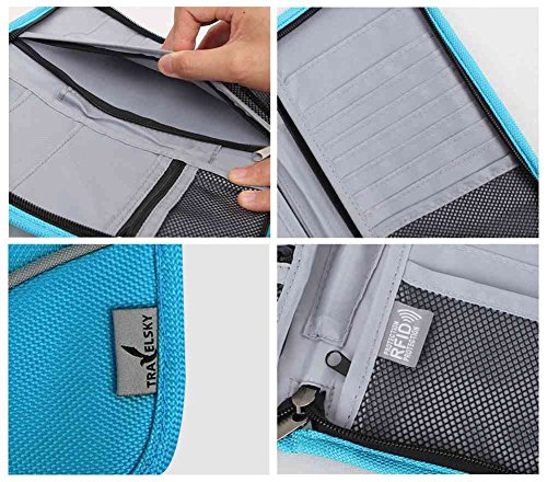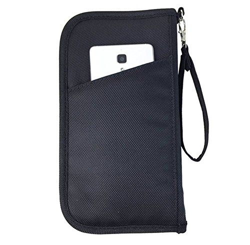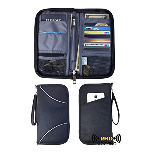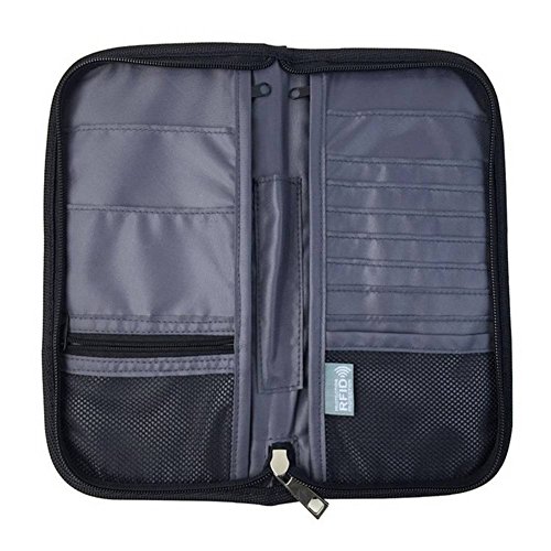 -. Feature : Material : Waterproof canvas / Product Dimension : 9.8 x 1 x 5.9 inches / Large Capacity : Passport, ID, map, credit cards, tickets, cash, coins, cell phone, pen, keys and other little things can all be well placed. / Structure : 1 Passport pocket, 1 map pocket, 1 enclosed grid pocket, 1 pen holder, 2 cash zip compartment, 1 documents pocket, 7 card slots, 1 grid ticket pocket, 1 external cellphone pocket outside. / RFID Blocking : Tested & approved by independent test Lab for frequency 10MHz to 3000MHz, including 13.56 MHz in which our passport, credit cards, debit cards and ID cards operate.