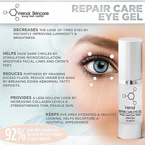 What it is formulated to do: This eye gel is an alternative to eye cream mainly because gels are faster acting and more absorbent. Treatment for dark circles and puffiness also contain Carnosine Triple Peptide w with Vitamin C to help prevent and correct the appearance of multiple signs of aging, resulting in a fresh, beautiful, youthful-looking eye area. The best eye cream for dark circles puffiness and wrinkles. This eye gel treatment addresses every eye concern - Potent Ingredients. Most effective eye gel available.