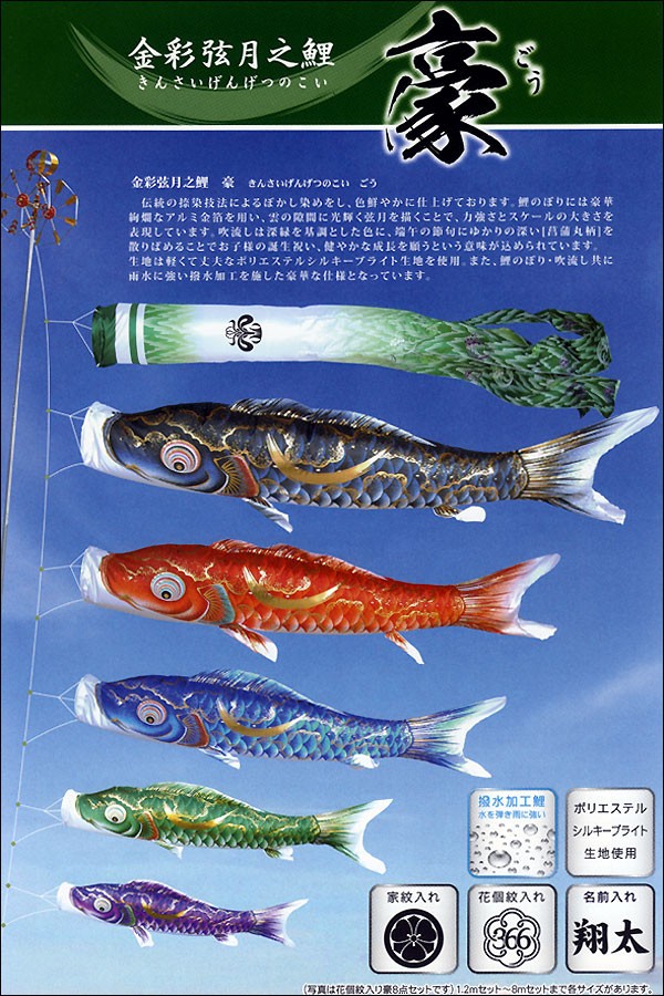 | 豪鯉 庭園用大型鯉のぼり スタンド砂袋式ポール付セット | 1.5m鯉3匹 | 2m鯉3匹 | 3m鯉3匹 3m鯉4匹 3m鯉5匹 | 4m鯉3匹 4m鯉4匹 4m鯉5匹 |