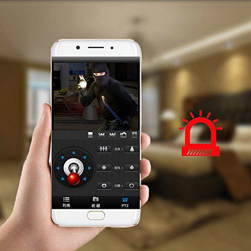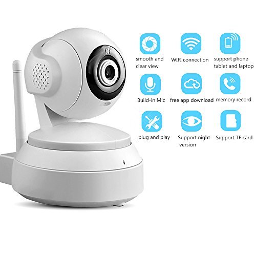 -. Feature : EASY SET-UP: Plug and play, connect it to your Wi-Fi network or by ethernet cable connection. Download VIPCAM on App Store or Google Play. Seamlessly HD video streaming and two-way audio via your smart phone, tablet, Mac and PC. / BROAD FIELD OF VIEW: Support remote Pan/tilt zooms. Wide 62 Degree Viewing Angle, 355 Degree x 120 degree covers every corner of your home. / NIGHT VERSION WITH LARGE RANGE. This HD IP camera provides a stunning clear vision through infrared red light even in the darkness! This HD IP camera provides a stunning clear vision through infrared red light even in the darkness! The range of the night vision is 32FT. / MOTION DECTECTION and TWO-WAY AUDIO: Intelligent motion detection, Two-way voice built-in mic and speaker. App alerts with snapshot&record(SD Card Required) to your mobile device and you can immediately warn the invader with the speaker. / SMART ALARM FOR NOTIFICATION AND TWO-WAY AUDIO CAMERA FOR REAL TIME COMMUNICATING. Receive messages sent by the wireless network camera from your phone! With the help of smart camera, every potential risk will be identified accurately and sent to you immediately. Motion detection camera technology allows you to avoid taping hours of inactivity