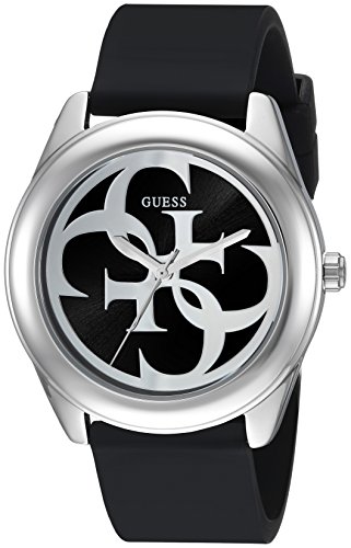 Watch Sizing Guide Find signature style with this Guess® watch. Metal case. Silicone strap with adjustable buckle closure. Round face. Three-hand analog display with quartz movement. Dial features silver-tone hands and hour markers, signature motif, and Guess detailing. Water resistant 3 ATM. Display case included. Imported. Guess Watch Warranty Measurements: Case Height: 40 mm Case Width: 40 mm Case Depth: 11 mm Band Width: 19 mm Band Circumference/Length: 8 1⁄2 in Weight: 2.2 oz This product may have a manufacturer's warranty. Please visit the manufacturer's website or contact us at warranty@support.zappos.com for full manufacturer warranty details.Feature