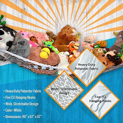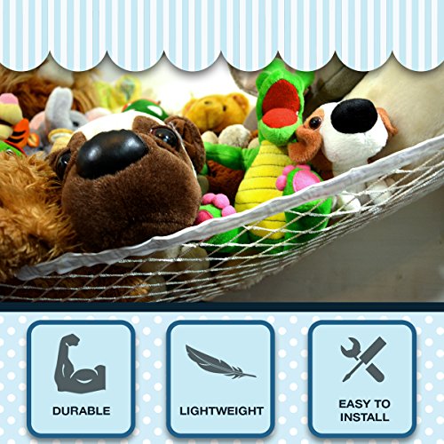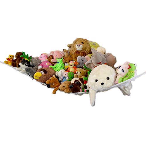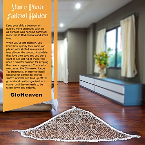 Keep your child's bedroom or nursery more organized with an all-purpose wall-hanging hammock made for stuffed animals and small toys. When you've got children, you know how quickly their room can pile up with stuffed animals and toys all over the ground. And while they love their toys and you don't want to just get rid of them, you need a smarter solution for keeping them more organized. That's why we created the GloHeaven Large Toy Hammock, an easy-to-install hanging net perfect for storing stuffed animals and toys up off the ground and neatly organized in a corner until they're ready to be taken down and enjoyed. Durable, Lightweight, Easy to Install These white wall nets attach to the corner of a wall using five small anchors that latch in firmly while providing the right flexibility and stretch to hold them in place. And because you can hang it at any height that suits you, and in almost any corner of the room, you can keep it high and away from kids, or kid-level so they can clean up their own messes! Product Details: - Toy Hammock Organizer (Large)