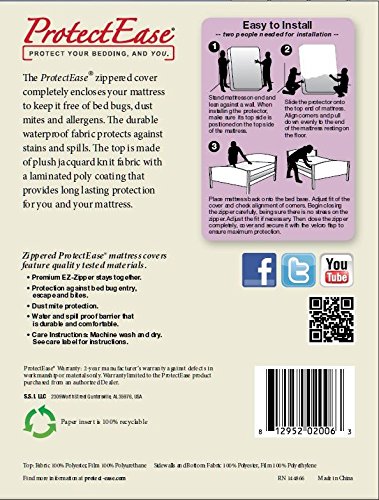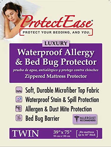 -. Brand : ProtectEase® -. Color : White -. Feature : Soft, Densely Woven Microfiber Top Fabric / Waterproof Stain & Spill Protection / Premium E-Z Zipper Stays Together / Allergen, Dust Mite & Bed Bug Protective Barrier / Allergist Recommended -. Label : Seam Seal International LLC -. Manufacturer : Seam Seal International LLC -. PackageQuantity : 1 -. ProductGroup : Home -. ProductTypeName : HOME_BED_AND_BATH -. Publisher : Seam Seal International LLC -. Studio : Seam Seal International LLC -. Title : ProtectEase® Luxury Waterproof, Allergy & Bed Bug Mattress Protector -. Warranty : 2-year manufacturer's warranty against defects in workmanship or materials only. Warranty limited to the ProtectEase product purchased from an authorized dealer.