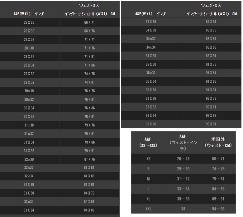 BUMPSをご覧いただきありがとうございます。当店はロサンゼルスから本物のアイテムだけを扱っておりますのでご安心してお買い物をお楽しみ下さい。商品はロサンゼルスからの発送となりますのでお時間に余裕をもってご注文下さいますようお願い致します。■Abercrombie&Fitch(アバクロンビーアンドフィッチ)アバクロはCool, Sexy, Vintage, Richのイメージでアメリカの若者から大きな注目が集まり日本でも有名芸能人が愛用していることで話題となり今ではアメカジ好きの必須アイテムとなっています。2009年12月に日本上陸以降も、さらに大きな注目が集まっているブランドです。アバクロウォッシュと呼ばれる独自の加工や生地感、多彩な色やプリントと丈夫な素材とヴィンテージ加工もアバクロの特徴です。■サイズ詳細はページの下部をご覧下さい。※当店はアバクロ公式発表のサイズを表示しております。アバクロンビー メンズ デニム ジーンズ ジーパン USA限定