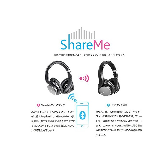 【ShareMe기술】:보통인 Bluetooth헤드폰에 이용으로 옵니다.독자적인 wireless 뮤직 쉐어 기능「ShareMe」에 의하고, 다른 ShareMe기능이 붙는 헤드폰과 페어 링 해 동시에 음악을 듣는 것도 가능합니다.친구나 가족과 음악이나 동영상의 음성을 간편하게 쉐어로 옵니다.