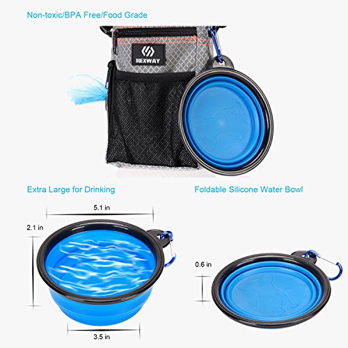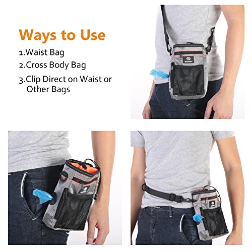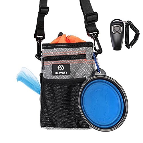 -. Title : REXWAY Dog Treat Pouch for Training, with Built-in Waste Bag Dispenser, Adjustable Waist Belt and Over Shoulder Strap, Bonus Free Collapsible Drinking Bowl & Clicker