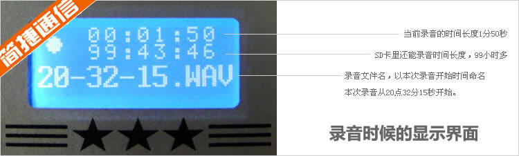 7、 无需电脑就能录音:录音保存到SD卡上,可随时更换SD卡,支持热插拔。用户可以自行购买SD卡(推荐使用金士顿SD卡或创见SD卡),支持最大8G的 SDHC卡,可随意更换,也可以将SD卡录音文件COPY到电脑上,用WINODWS自带的播放器播放录音,也可用暴风影音、QQ影音等播放器软件播放。