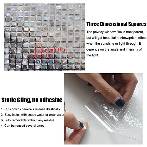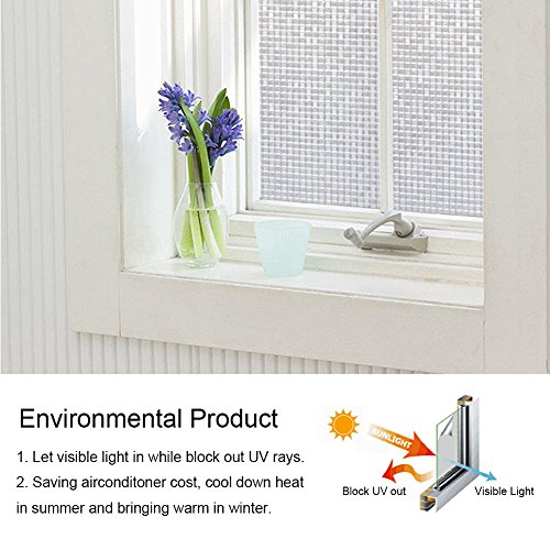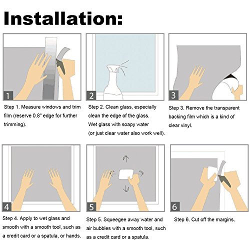 Static Cling, No Adhesive Privacy Window Film: 1. Glue free design cuts down chemicals release drastically; 2. Easy to install with soapy water or clear water (more detail instructions, please read the product description below); 3. Fully removable without any residue; 4. Can be reused even after several years if not be damaged or smudged.