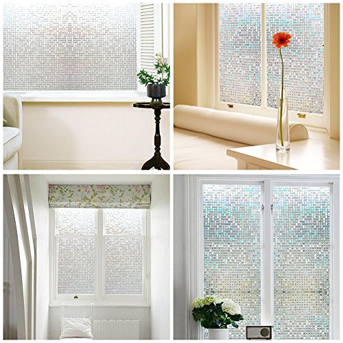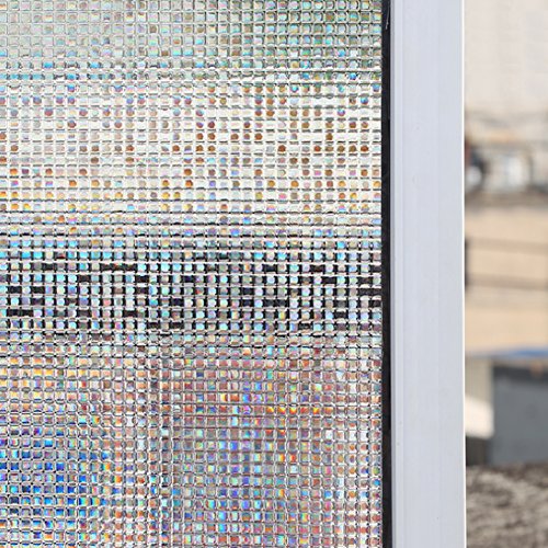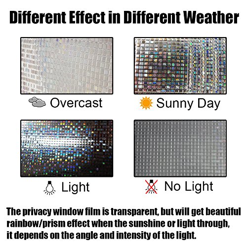 Privacy Protection Window Film: Provides privacy and allows the lights in. 40 inches away, the protection of privacy effect ≥95% (Great privacy protection, applicable for most cases but not recommended for bathroom application). The privacy window film is transparent, but will get beautiful rainbow/prism effect when the sunshine or light through, it depends on the angle and intensity of the light.