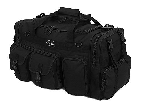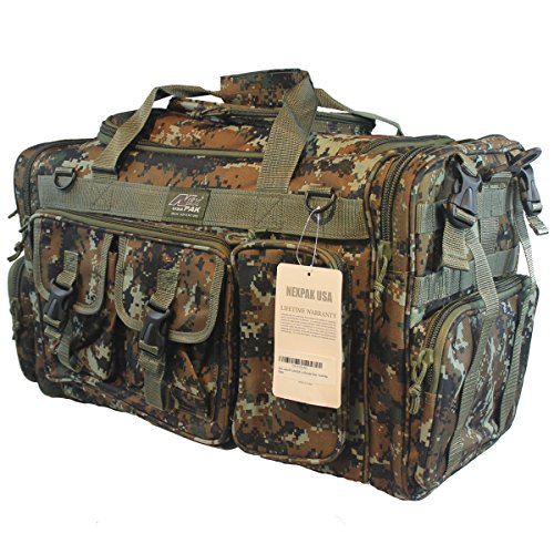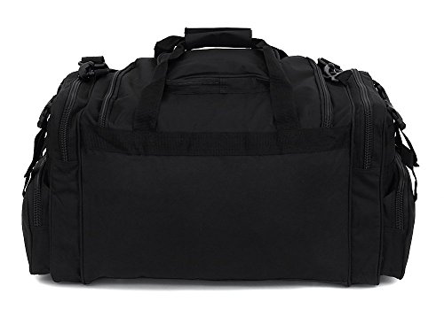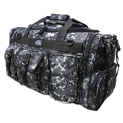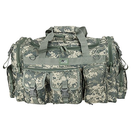 -. Feature : Material: 600D High Density Polyester for daily durable use. Interior water proof PVC lining provides protection from water. Available in Black, ACU Digital Camo, ACU Navy Digital Camo, Olive Green, Tan, Hunters Camo, Multi Camo / Excellent storage: 2 front buckle strap pockets, 2 zippered front pockets, U-shape opening main pocket, zippered pocket on top of main compartment flap, 2 side zippered pockets on each side / Attachment points: molle strap system on sides, 2 front D-rings, 2 side (4 total) buckle snap straps / Removable adjustable shoulder strap with pad; Heavy duty branded zippers; main handle has wrap-around velcro strap for better grip / Dimensions: 26"L x 13"W x 11"D; Ideal use: military, tactical Assault gear, hiking, hunting, camping, sports & gym