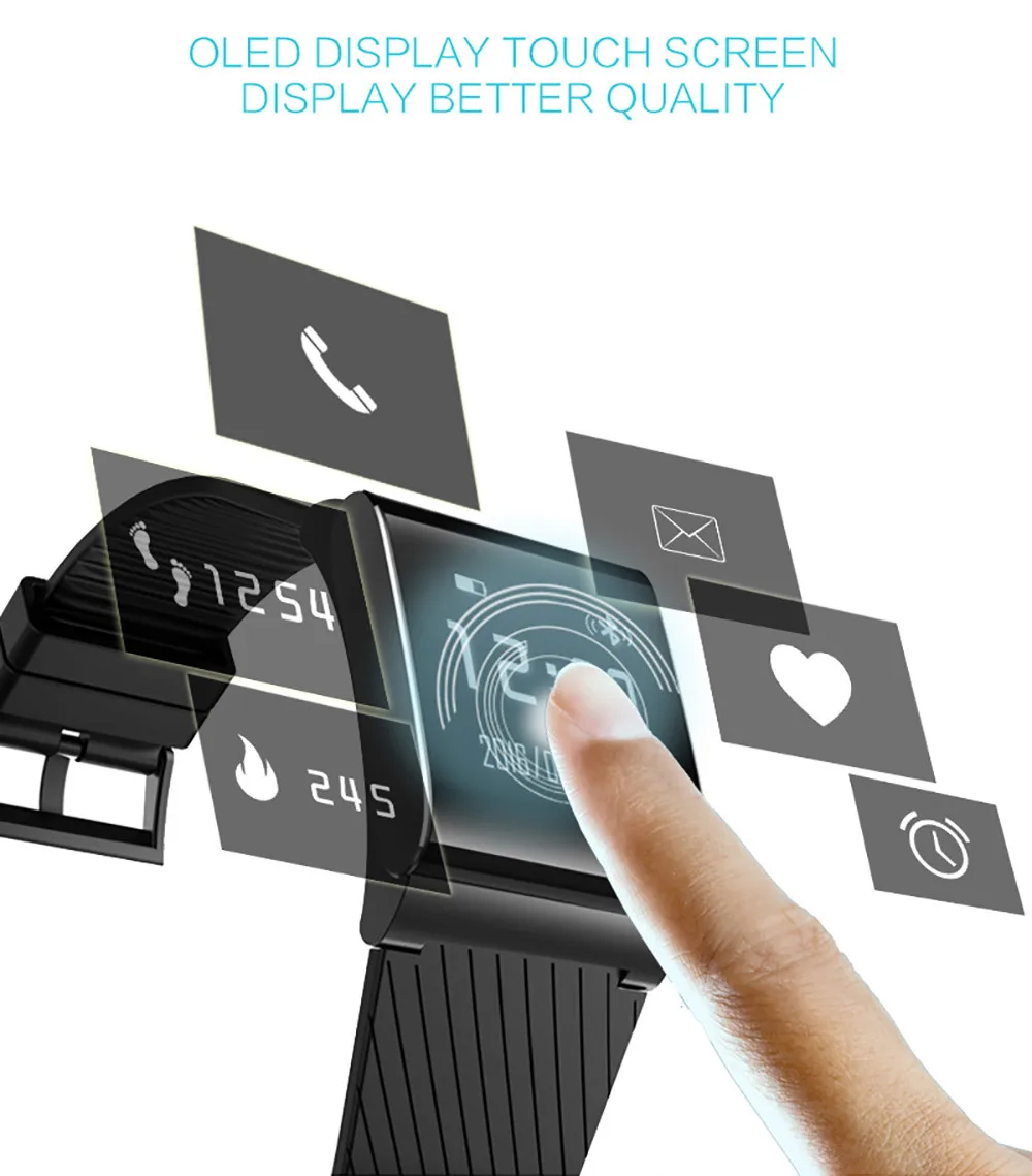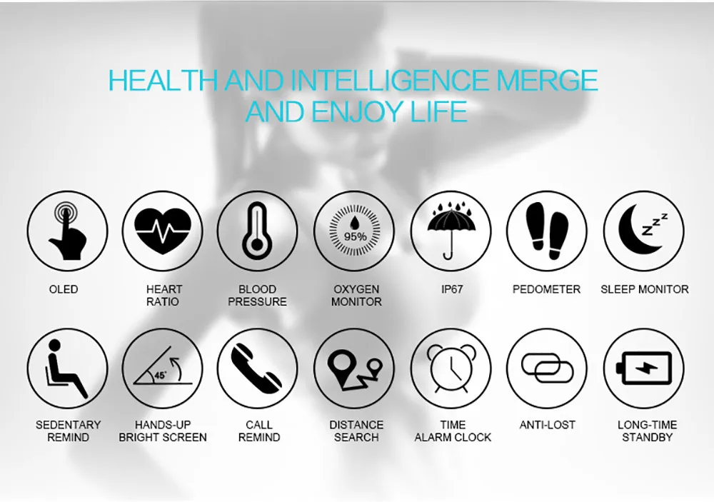 Function:Passometer,Fitness Tracker,Sleep Tracker,Message Reminder,Call Reminder,Push Message,Alarm Clock,Heart Rate Tracker