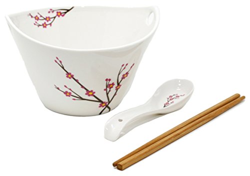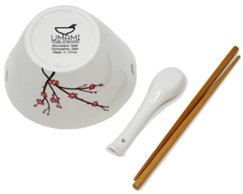Ramen Soup Bowl Set of 1 - Chopsticks, Hooked Spoon, White with Japanese Plum (Ume) Flowers, by Umami Tableware