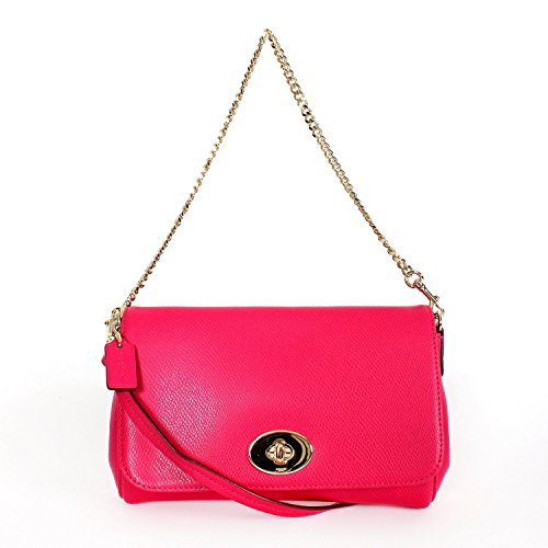 -. Feature : Crossgrain leather / Inside open pockets / Turnlock closure, fabric lining / Double strap with 21" drop for shoulder or crossbody wear and a 7 1/2 chain strap drop / 8 3/4" (L) x 5 1/4" (H) x 1 1/2" (W)