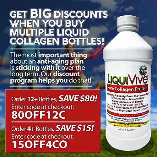 -. Feature : COLLAGEN IS A MIRACLE WORKING ANTI-AGING POWERHOUSE - We lose 1-2% of our collagen every year after age 30, which is when physical aging becomes noticeable. LiquiVive collagen is an essential anti-aging supplement that targets skin care problems and supports overall skin, hair and connective tissue function and structure throughout the entire body. Also supports the reduction of body fat, while maintaining and building lean muscle tissue. May help to naturally increase your metabolism. / AMAZING ANTI-AGING BENEFITS. Builds and strengthens bone matrix. Collagen is the mechanical strength of bone, joints and the entire structure of your body. Repairs and builds connective tissue for improved elasticity, improves blood vessel quality to help improve circulation, and can help promote wound healing and a clearer complexion--all physiological attributes that break down naturally as we age. / LIQUID COLLAGEN PROTEIN IS FAR MORE ABSORBABLE THAN PILLS - The problem with collagen pills and tablets is they have to go through the entire digestive process to be broken down, and you body only uses what is left over. Our liquid collagen peptides have the highest bioavailability and net protein utilization, because it is in liquid form. It is predigested and hydrolyzed with natural enzymes before bottling. Ready-to-use and no mixing required. Liquid delivery is perfect for people unable to swallow pills, or difficulty consuming solids. / SUPER CONCENTRATED FORMULATION - 240,000mg of collagen amino acid peptides per bottle. Add the concentration to the dramatically higher absorption rate over pills, and you have a super collagen delivery system. This bio-active collagen contains over 90% pure protein concentration. / BUILD AND REPAIR SKIN, HAIR AND NAILS FROM THE INSIDE OUT. Americans spend a fortune on anti-aging creams and serums with dubious results. Doesn't it make more sense to internally replace the cause of your outward aging by collagen supplementation? Collagen is the raw material of your hair, skin and nails (among many other things), and it is only in replacing this loss inside your body where you will see real results wiping away aging markers.