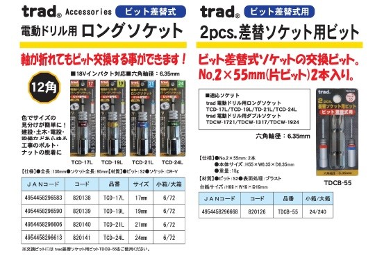 色でサイズの見分けが簡単に!建設・土木・電設・設備などあらゆる工事のボルト・ナットの脱着に。12角 18Vインパクト対応。六角軸径 6.35mm ※交換ビットにはtrad差替ソケット用ビットTDCB-55をご使用ください。
