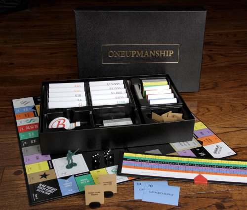 - Feature : This is an old school, grown-up board game that might just turn your whole family into "greedy, self-serving punks." / We're kidding. Almost. So step up to the plate and have some wicked Machiavellian fun: Invest in the stock market, gobble up real estate and collect as many "Trophies" as you can. Yikes! The Taxman Cometh. Free Lunch anyone? / But wait a sec, $ Cards add hilarious physical and mental challenges to the equation - declare a "Thumb War", Indian Arm Wrestle, 25 pushups anyone? Alphabet Memory... what? / ONEUPMANSHIP is an open invitation to everyone who's sick to death of video game crack, or hates the idea of playing the same-old tired, unfun "classics", or who doesn't find card games for horrible people particularly entertaining. We don't think there's anything wrong with being a "heartless, cutthroat jerk" or a "smelly, basement-dwelling capitalist swine" is there? Of course not. The only question is, then, are you ready to take one or two on the chin?