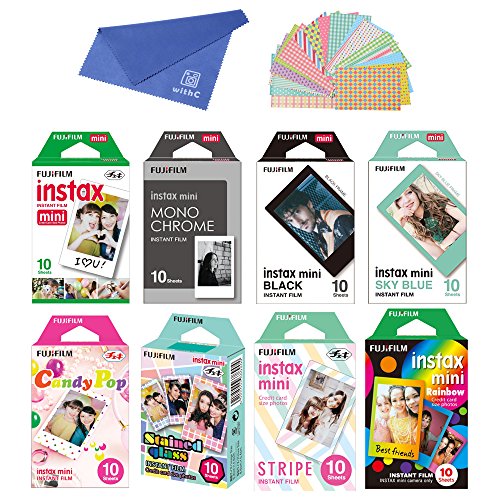 Fujifilm Instax Mini Instant Film 8-SET , Monochrome + Black + Sky Blue + Single + Candy Pop + Stained Glass + Stripe + Rainbow + Cloth + Sticker for Mini 90 8 70 7s 50s 25 300 Camera SP-1 Printer