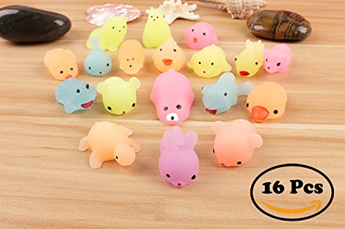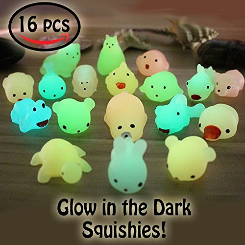 Product Description These fun glow in the dark squishy toy animals are cute, soft to the touch, and can now be played in the dark! Sure to be a hit for your kids and their friends. Great toy gift for the little explorers in your home. Randomly packed with 16 different animal shapes squishies per pack. 0
