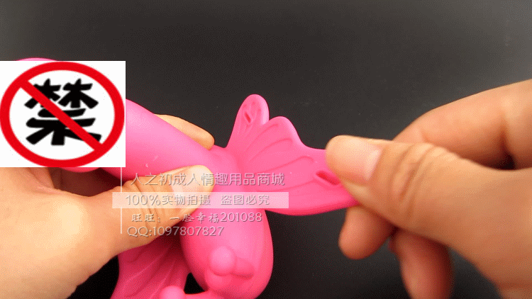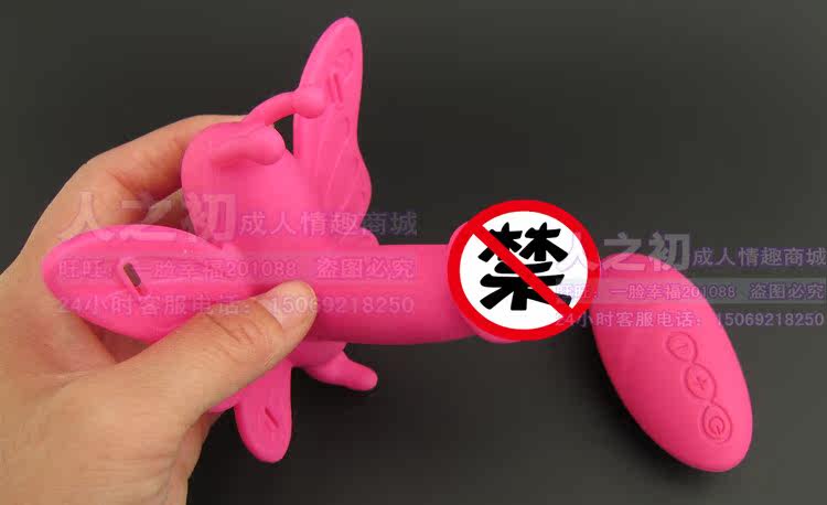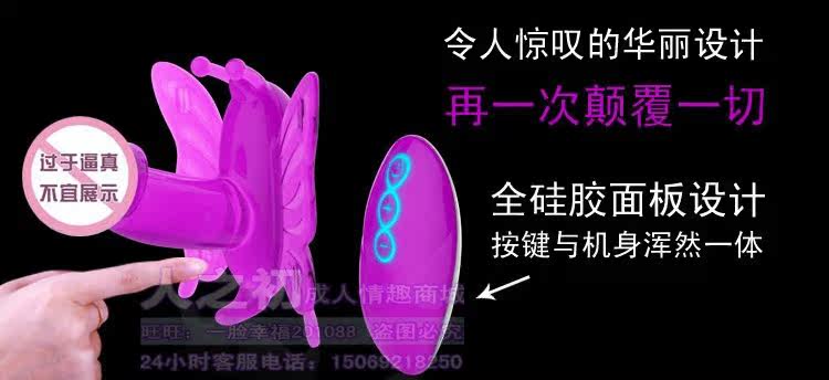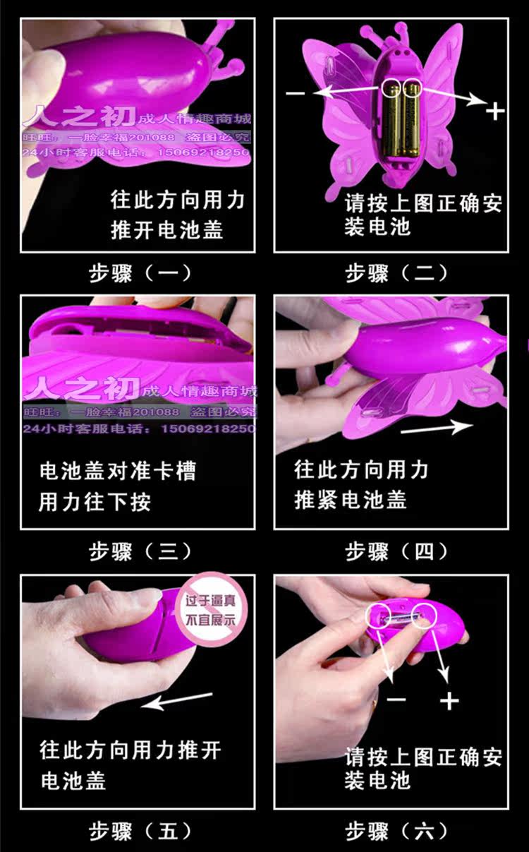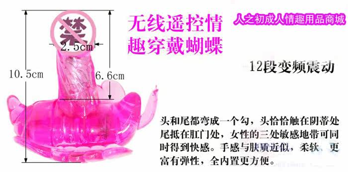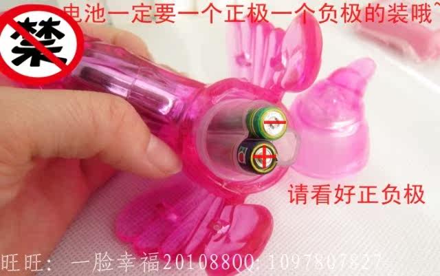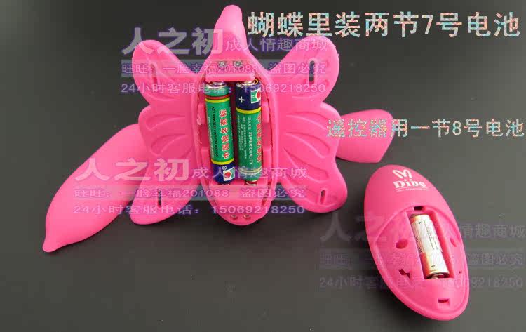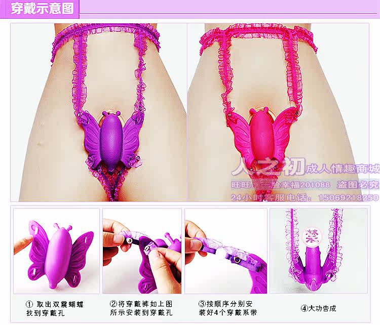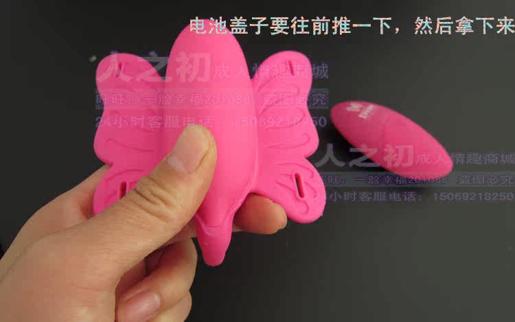 将蝴蝶的头部、尾部分别置于阴蒂和肛门部位,系好系带(方法类似内裤),按电池盒图示装好电池;调节震动频率至舒适为止