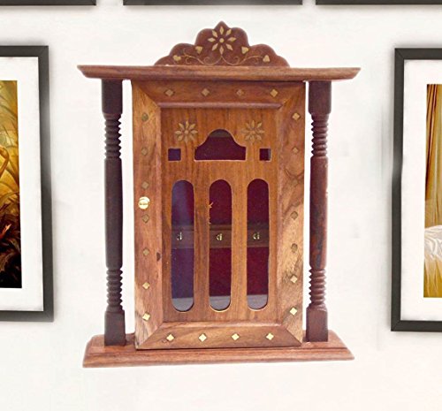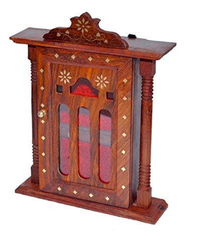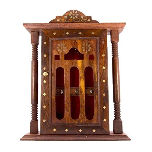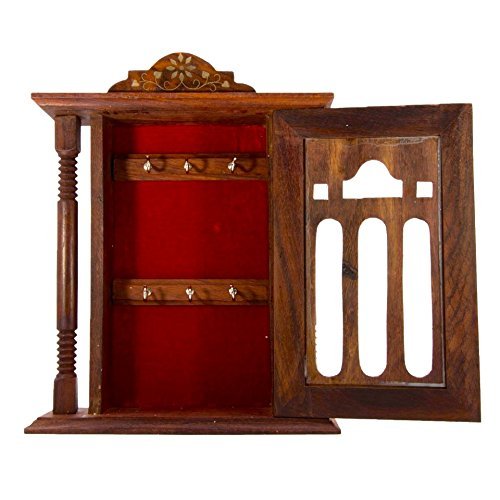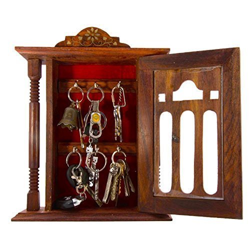 Special valentine day gift, Wooden Key Box, Double Pillar Key Holder, Inlay Design Single Door Cabinet Key Box, Key Security Box, Brown Color Key Rack Organizer with 6 Hooks, 11 Inch